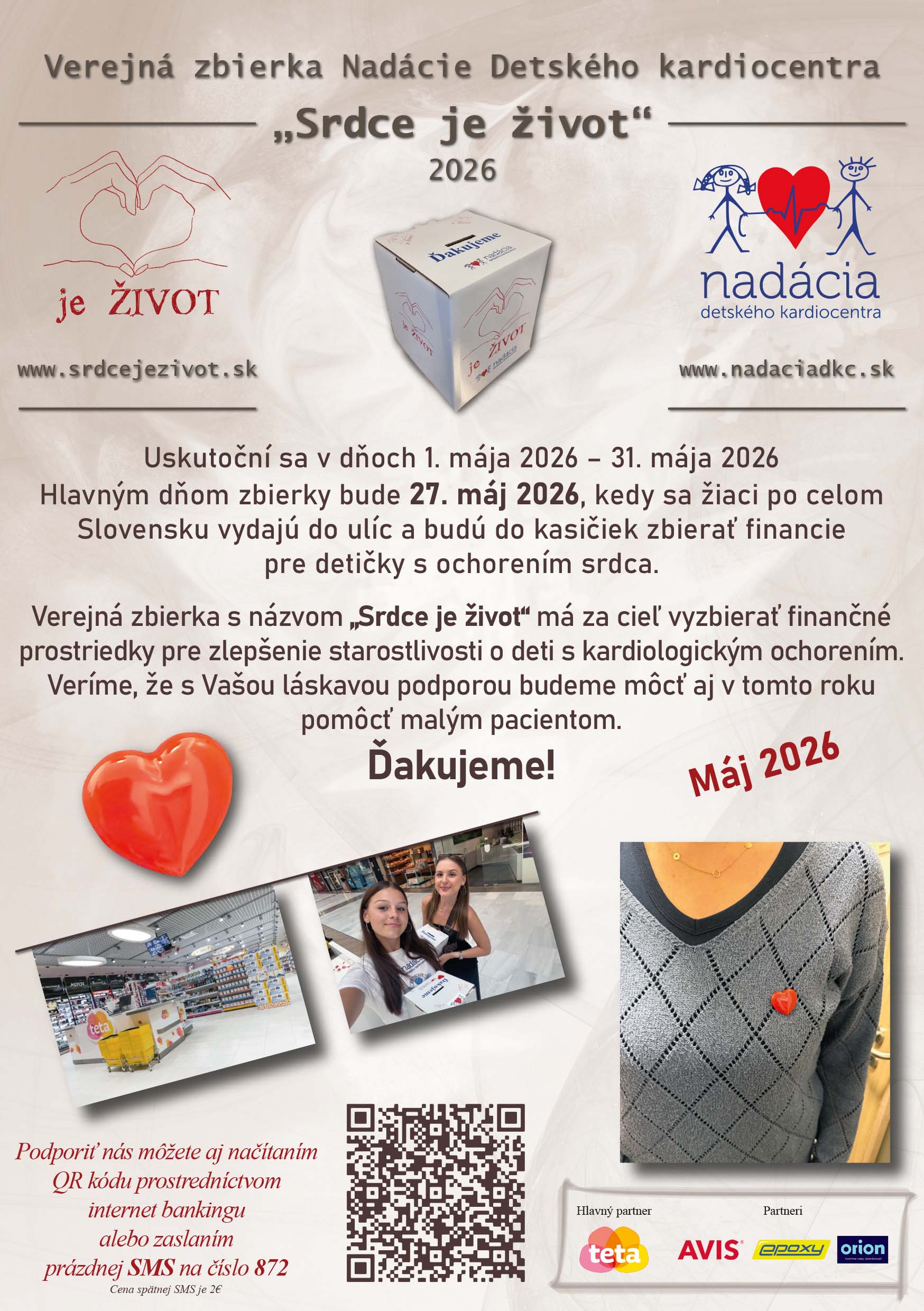 Tretí ročník verejnej zbierky Nadácie Detského kardiocentra „Srdce je život“ je pred nami. Nesmierne sa tešíme na vás všetkých, ktorých stretneme v uliciach Slovenska. Stovky našich dobrovoľníkov sa vydajú smerom k vám, ktorí máte záujem podporiť malých pacientov s ochorením srdiečka a získať krásny odznak s príznačným červeným srdiečkom. To bude na každom z vás charakterizovať pomoc našim „srdiečkárom“.